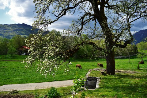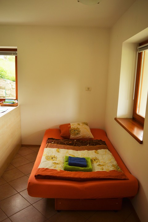 Located in a peaceful sunny village, at the foot of Krasjivrh. Our house lies at the edge of the village Magozd, above the waterfall Kozjak, 7 kilometres from Kobarid. Our apartment is on the ground floor of the house, has own entrance, kitchen, bathroom, bedroom, covered terrace and plenty of outdoor space where you can enjoy your breakfast, grill something delicious on the barbecue, lie in the sun or in the shade. You can let your children to play carefree and listen to yourself or just enjoy and be one with nature.