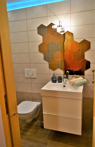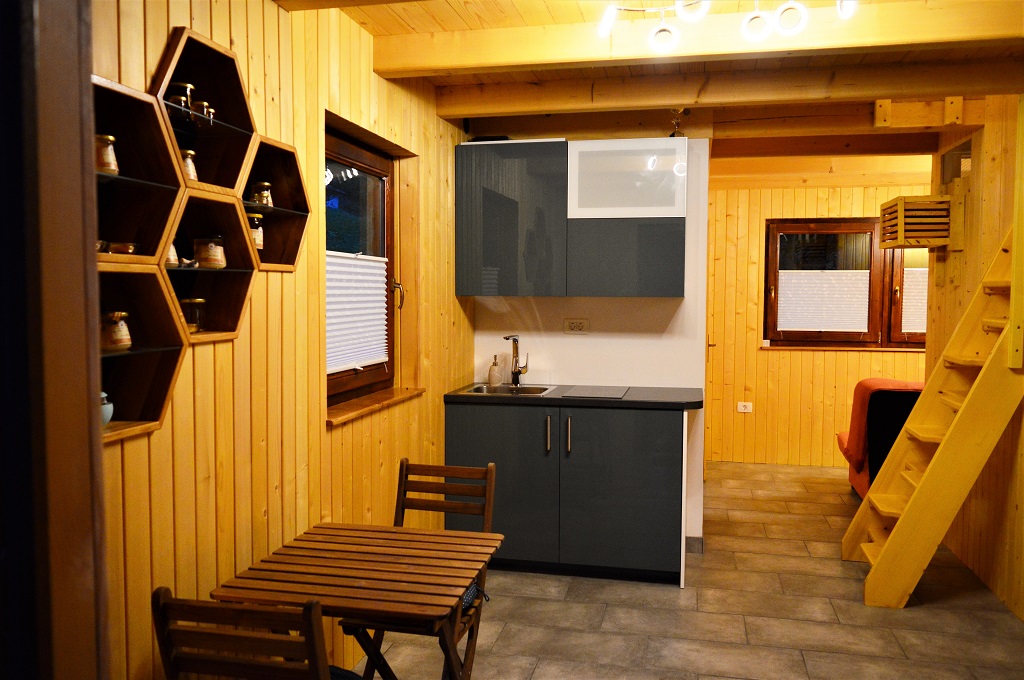 - Bedroom: double bed, system for intensive inhalation of aerosol direct from beehive for 2 people, observation of bees through the glass floor.
