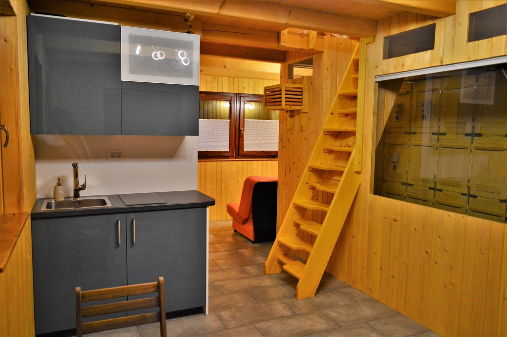 - Living space: kitchen (only for beverages), electrical cooker, fridge, sofa, panoramic windows with mountain views.